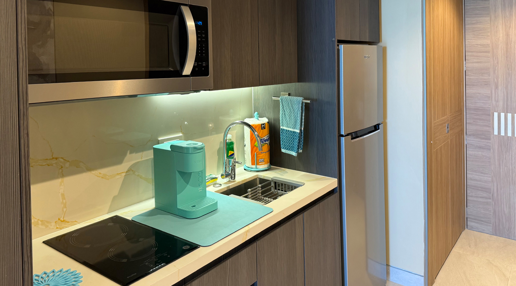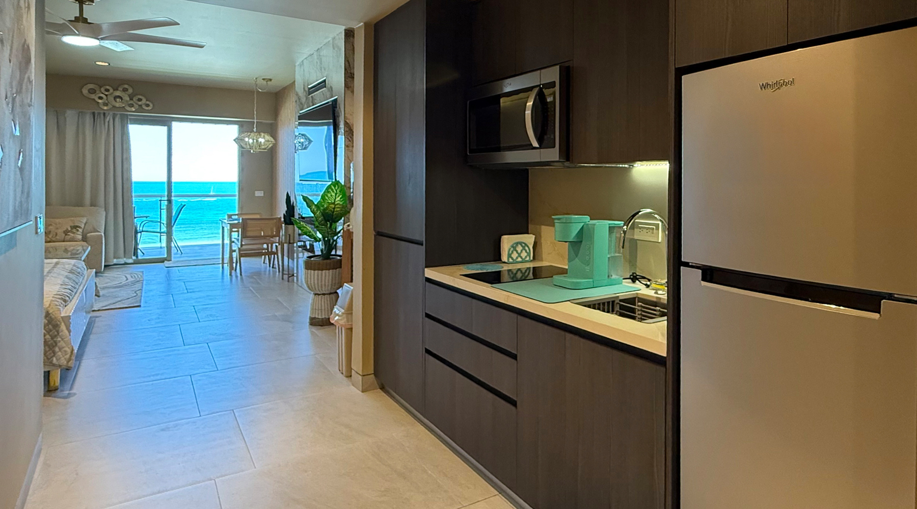 Inside, you’ll find a plush king-size bed, a comfortable sofa, and a full bath designed with relaxation in mind. The half kitchen includes a two-burner stovetop, overhead microwave, refrigerator, and essentials for light cooking or morning coffee with a view. For added convenience, the unit also features an in-suite washer and dryer.